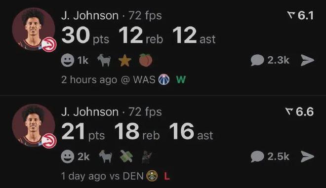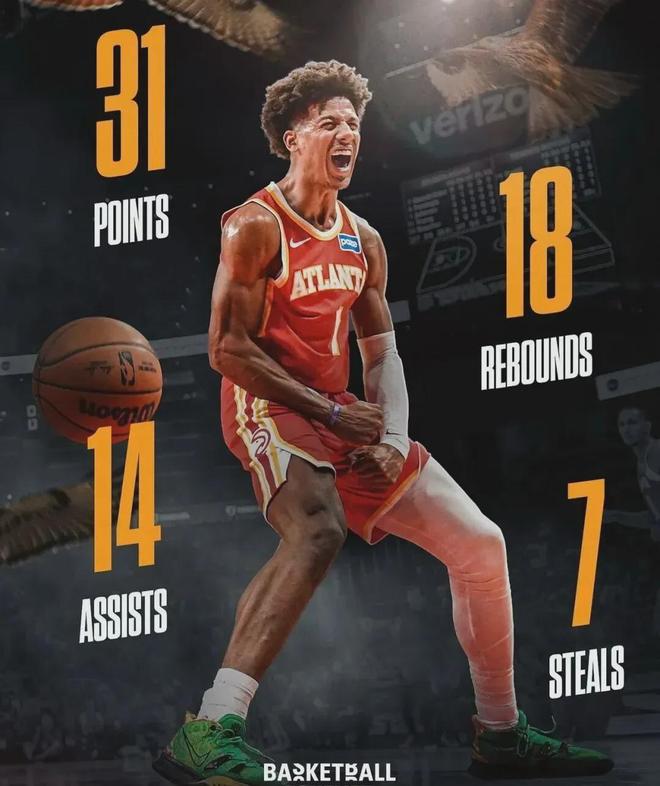 年僅23歲的約翰遜,已成長(zhǎng)為新鷹王,本賽季至今場(chǎng)均出戰(zhàn)35.2分鐘,砍下23.4分10.5板7.9助1.6斷,投籃命中率53.4%,場(chǎng)均以40.4%命中率扔進(jìn)1.6記三分球,帶領(lǐng)老鷹以14勝11負(fù)排名東部第九,可謂是前途無(wú)量。